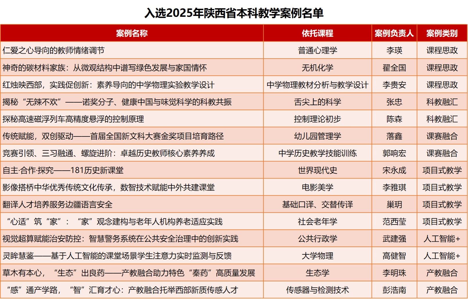 师大新闻网讯近日,陕西省教育厅公布2025年本科教学案例遴选结果,我校《仁爱之心导向的教室情绪调节》等15个教学案例成功入选。