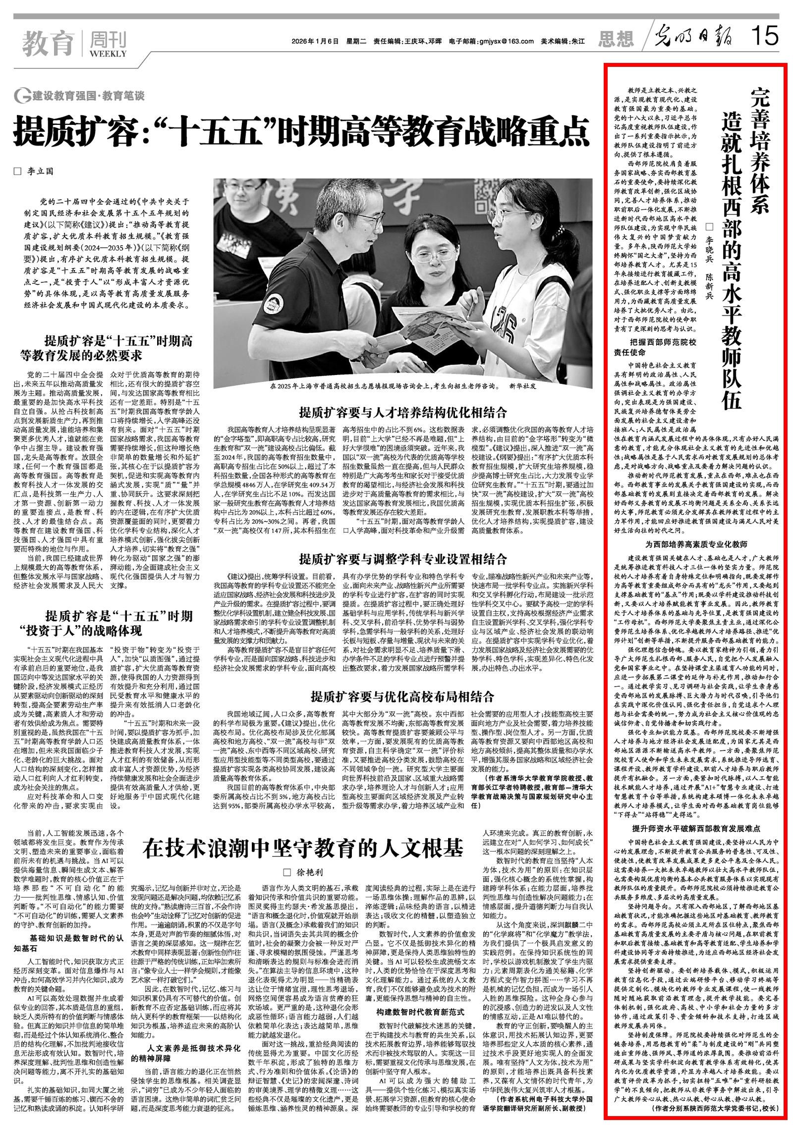 师大新闻网讯 1月6日,《光明日报》刊发我校党委书记李晓兵、校长陈新兵的署名文章“完善培养体系 造就扎根西部的高水平教师队伍”。文章从“把握西部师范院校责任使命”“为西部培养高素质专业化教师”“提升师资水平破解西部教育发展难点”等三个层面,深刻阐释了西部师范院校在造就扎根西部的高水平教师队伍方面的使命职责,充分彰显了我校始终胸怀“国之大者”,坚持为西部培养教育人才,尤其是15年来接续进行教育援藏工作,在培养适配人才、创新支教模式、强化职业支撑等方面绵绵用力,为西藏教育高质量发展培养大批优秀人才的时代担当。