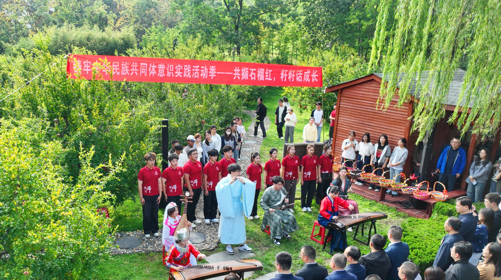 活动现场,各族师生以激昂的集体朗诵、跃然眼前的中华舞龙与悠扬的乐器演奏,精彩展现了“石榴红成长工程”的育人成果。活动现场洋溢着各族学子在深度交往交流交融中亲如一家的热烈氛围。随后,师生共赴“民族团结石榴园”,亲手采摘品尝象征团结的石榴果实,让民族团结的种子在实践体验中润物无声,于心田深处生根开花。