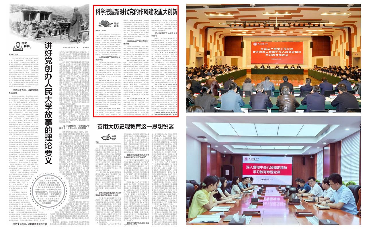 3月19日,学校正式启动深入贯彻中央八项规定精神学习教育。学校党委严格按照党中央和教育部有关工作要求,准确把握开展学习教育的目标要求,深刻领会习近平总书记关于加强党的作风建设的重要论述和中央八项规定及其实施细则精神,发布《深入贯彻中央八项规定精神学习教育简报》6期,各单位在全国高校思政网上发布学习动态和典型经验21篇。校领导班子成员为师生党员讲授专题党课11次,全校处级干部讲授专题党课290余次。《人民日报》《光明日报》《中国教育报》等中省主流媒体刊发我校理论文章10余篇。学校围绕招生、基建工程、师德师风、后勤管理、科研经费、校办企业等重点领域开展系统整治,校级领导班子集中整治台账中累计提出整改措施29项,各二级党委(党总支)与党政职能部门共制定整改措施500余项。