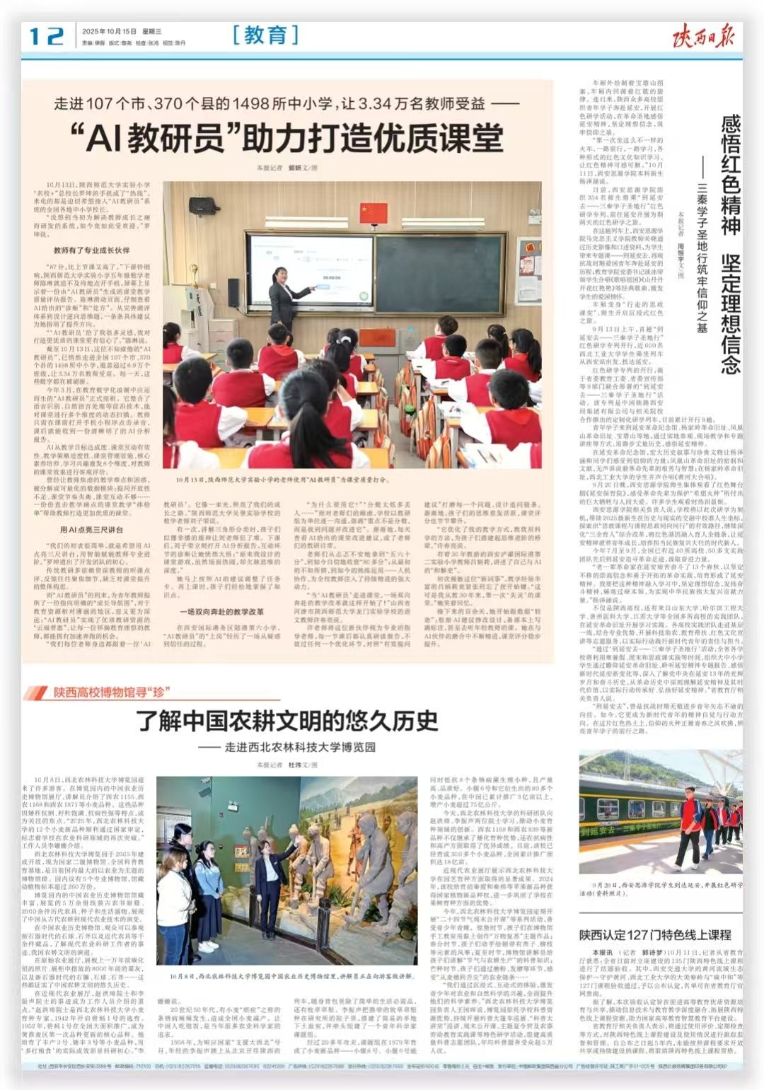 师大新闻网讯10月15日,《陕西日报》第12版以“‘AI教研员’助力打造优质课堂”为题,报道我校自主研发的课堂教学质量分析工具“AI教研员”系统上线以来,已走进107个市、370个县的1498所中小学,让3.34万名教师受益。