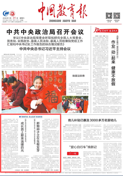 师大新闻网讯 1月31日,《中国教育报》头版“青春作答 雪山见证”后续报道栏目刊登了拉萨北京实验中学初二学生顿珠卓玛的文章《成长路上那束温暖的光》,以及拉萨中学毕业生、吉林大学学生索朗德吉的文章《那颗种子正在生根发芽》。两篇文章以亲述的形式,通过具体、生动的事例,展现了陕西师范大学学子援藏支教所带来的深远影响,特别是教育如何点亮心灵、塑造梦想,以及这种奉献精神在代际间的传递。