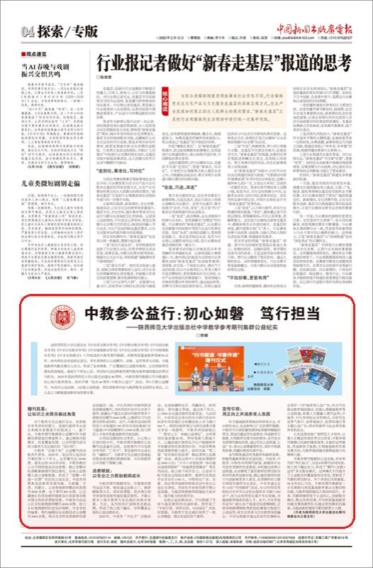 师大新闻网讯 2月12日,《中国新闻出版广电报》刊发《中教参公益行:初心如磐 笃行担当——陕西师范大学出版总社中学教学参考期刊集群公益纪实》文章,以中教参2025年各项公益活动为例,向读者全面介绍了我校中教参八种期刊深耕我国基础教育沃土50余年,始终将社会效益放在首位,用实际行动诠释了教育期刊服务教育强国建设的责任与担当。
